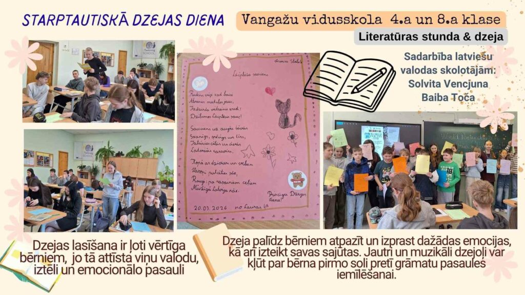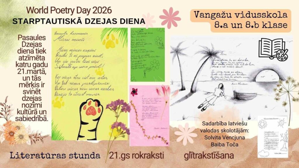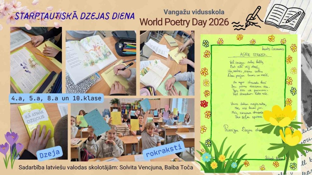 Vangažu vidusskolā atzīmējām Starptautisko Dzejas dienu (World Poetry day 2026), piešķirot tai īpašu, radošu nokrāsu! 4.a, 5.a, 8.a, 8.b un 10.klases skolēni piedalījās dažādās aktivitātēs, kas ļāva izpausties un dalīties ar savām dzejas rindām. (Sadarbība latviešu valodas skolotājām: S.Vencjuna un B.Toča).