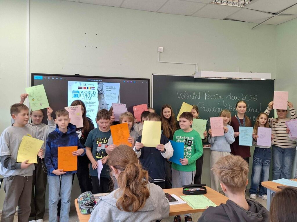 Dzeja mūs vieno un atver sirdis, un mēs priecājamies, ka šo dienu varējām pavadīt kopā – pilni ar jauniem vārdiem, domām un sajūtām, kā arī sadarbojoties ar dažādām klasēm un citu Eiropas valstu skolēniem.
